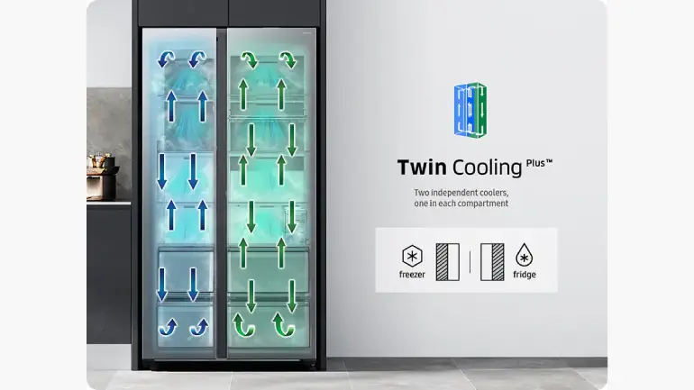 Ensures food stays fresher for longer*. Twin Cooling Plus™ regulates the temperature and humidity in the fridge and freezer using independent evaporators, fans and air ducts. It keeps food in the right conditions and protects its taste by preventing odors from mixing between compartments.