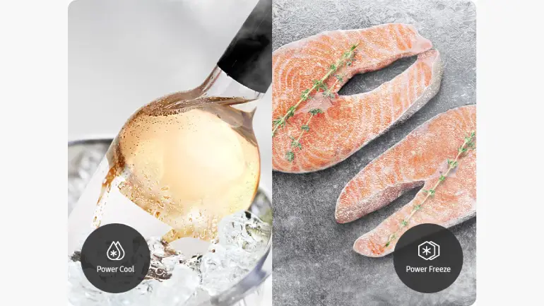 Enjoy fast cooling performance. At the touch of a button, Power Cool distributes powerful cold air throughout the refrigerator to quickly cool groceries or your favorite drinks. Power Freeze distributes very powerful cold air throughout the freezer. It is suitable for freezing or storing frozen food and making ice.