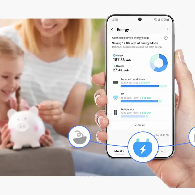 * Only available on machine learning model products equipped with AI algorithms. AI Energy Mode must be enabled in the SmartThings app, available on Android and iOS devices. Wi-Fi connection and Samsung account required. Compatible devices https://www.samsung.com/gr/smartthings/compatible-devices/
