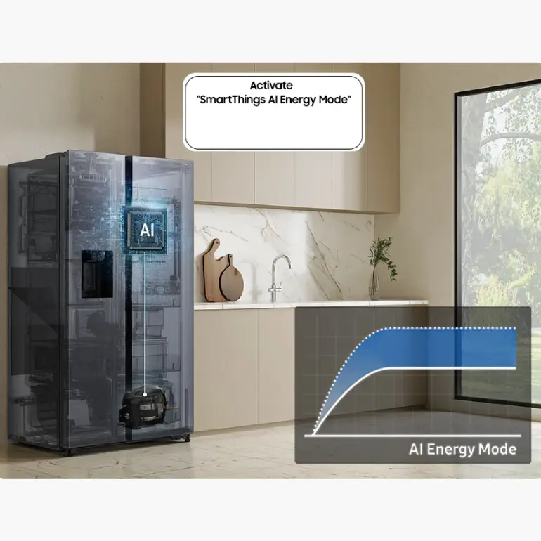 Monitor and manage energy with the AI Energy feature in SmartThings Energy*. If your estimated energy consumption exceeds a preset target, it lets you activate the energy-saving mode**. It intelligently adjusts the compressor speed and defrost cycle based on usage patterns and environment.