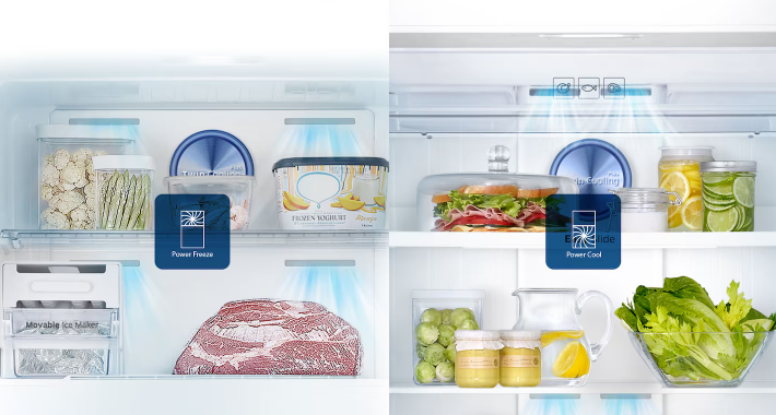 Rapidly disperses cold air for quick freezing or cooling. With the press of a button, the Power Cool function is activated, instantly cooling food or drinks, while the Power Freeze function is suitable for freezing or preserving frozen foods and making ice.