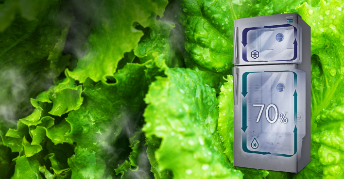 The Twin Cooling Plus creates a favorable environment for preserving fresh food in the refrigerator with 70% humidity, compared to 30% in a conventional refrigerator with the freezer on top.