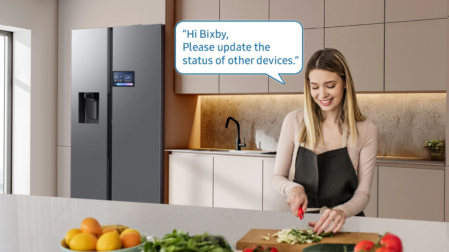 Enjoy a convenient way to control your refrigerator. Samsung Bixby is built in, so you can adjust functions, select programs, and ask questions by speaking in English. With the latest update, Bixby understands the context of the conversation and can recognize multiple commands in a single sentence. (Greek not supported)