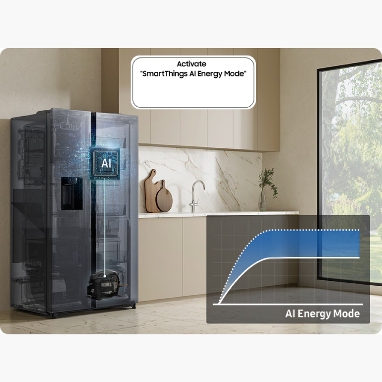 Easily monitor and manage energy with the AI Energy feature in SmartThings Energy. If your estimated consumption exceeds your target, you can activate the energy-saving mode. The system intelligently adjusts the compressor speed and defrost cycle based on your usage pattern and environment.