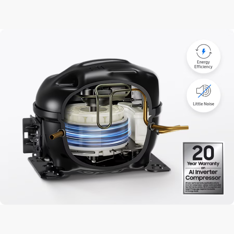 Keep your food consistently cool. With the help of an AI algorithm, the system adjusts its speed according to your usage patterns, saving energy. The motor comes with a 20-year warranty (only for the spare part after the 5th year).